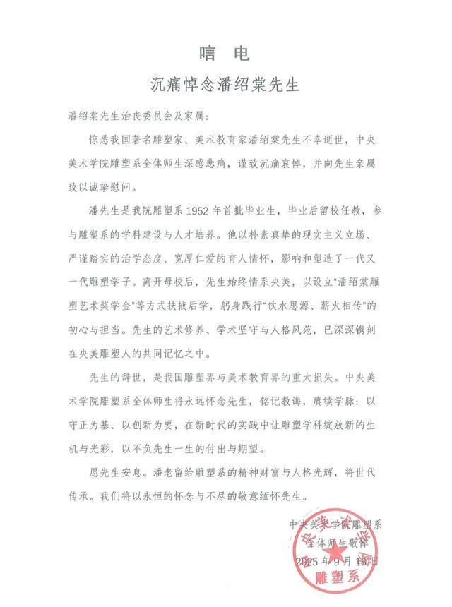 新快报记者获悉,著名雕塑家、美术教育家潘绍棠先生于9月18日仙逝,享年96岁。中央美术学院雕塑系发《唁电》表示,“先生的辞世,是我国雕塑界与美术教育界的重大损失。中央美术学院雕塑系全体师生将永远怀念先生,铭记教诲,赓续学脉:以守正为基、以创新为要,在新时代的实践中让雕塑学科绽放新的生机与光彩,以不负先生一生的付出与期望。”