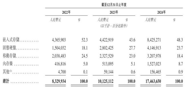 江波龙电子2024年来自嵌入式存储的收入为84.25亿元,占营收的比例为48.3%;来自固态硬盘的收入为41.47亿元,占比为23.7%;来自移动存储的收入为32.1亿元,占比为18.4%;来自内存条的收入为15.27亿元,占比为8.7%。