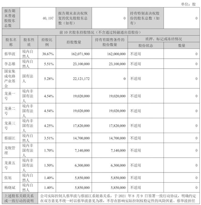 IPO前,蔡华波直接持股38.67%,李志雄持股为5.51%,国家集成电路产业基金持股为5.28%,龙熹一号、龙熹二号分别持股为4.54%,龙熹三号持股为4.25%,蔡丽江女士直接持股3.51%,龙舰管理持股为1.7%,龙熹五号持股为1.5%,张旭、杨晓斌分别持股为1.4%。