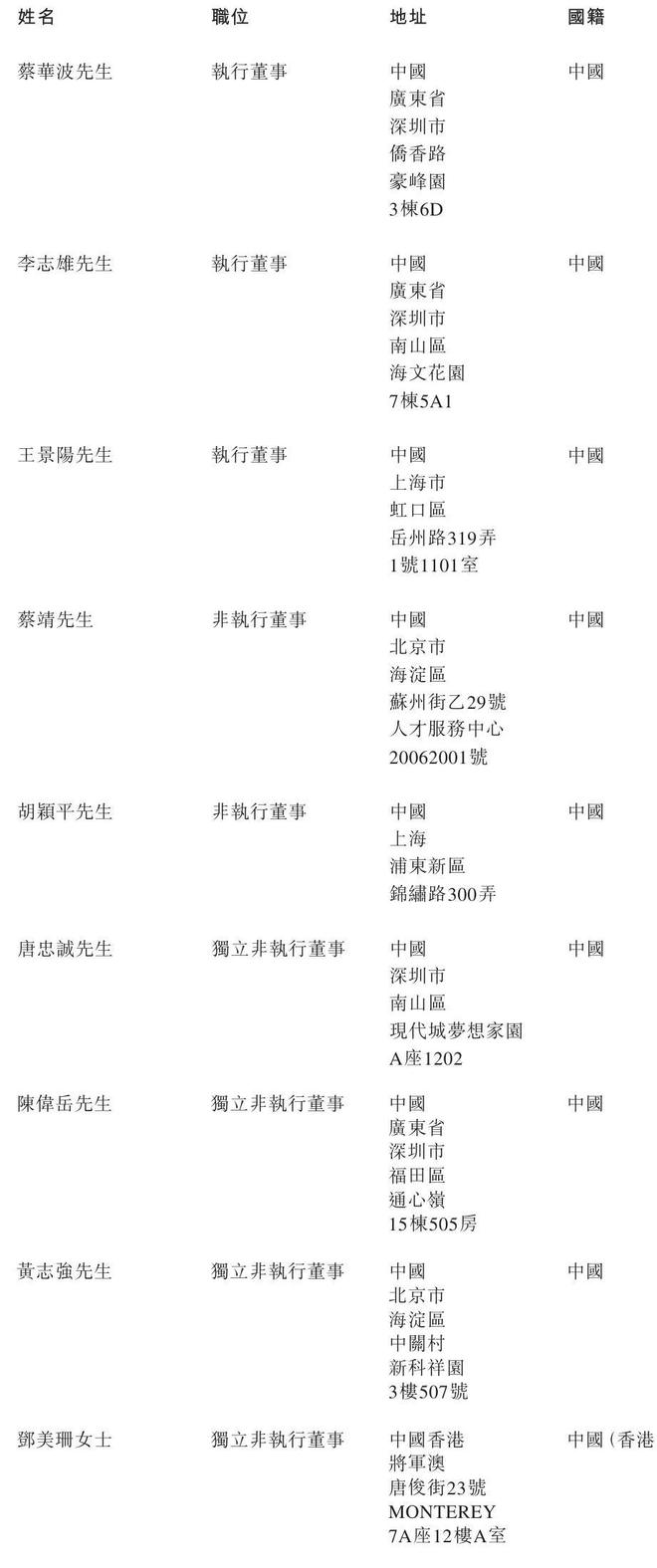 江波龙电子执行董事分别为蔡华波、李志雄;非执行董事分别为蔡靖、胡颖平;独立非执行董事分别为唐忠诚、陈伟岳、黄志强、邓美珊女士。