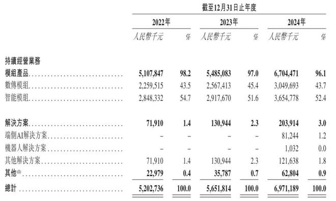 广和通2024年来自数传模块收入为30.5亿元,占比为43.7%;来自智能模块的收入为36.55亿元,占比52.4%。
