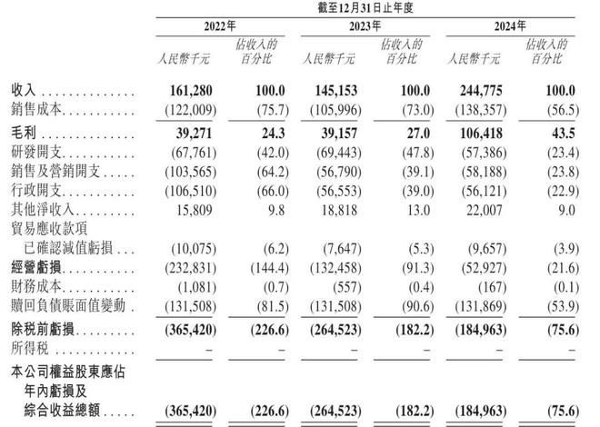 云迹科技2022年、2023年、2024年权益股东应占年内亏损分别为3.65亿元、2.64亿元、1.84亿元;年内亏损率分别为226.6%、182.2%、75.6%,总体处于亏损持续减少的状态。