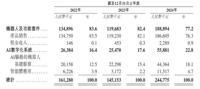 云迹科技收入主要包括机器人及功能套件和AI数字系统两部分,其中,云迹科技2024年来自机器人及功能套件的收入为1.89亿元,占总收入的比例为77.2%;来自AI数字系统的收入为5588万元,占营收的比例为22.8%。