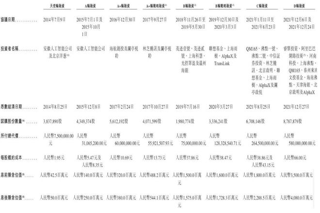 云迹科技2021年12月完成5.8亿元D轮融资,投资方包括睿聚投资、阿里巴巴网络技术(5)、河南 科投、上海沸点、 QM165、泰州东南 文投基金、海南沸 点、天津海银、北京启明及AlphaX,每股成本为66元,投前估值为35亿元,投后估值为40.8亿元。