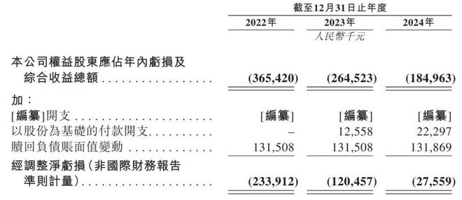 云迹科技2022年、2023年、2024年经调整净亏损分别为2.33亿元、1.2亿元、2756万元。