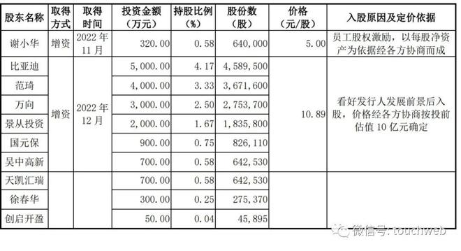 2022年12月,比亚迪、范琦、万向、景从投资、国元保、吴中高新、天凯汇瑞、徐春华、创启开盈对新广益进行增资,共投资1.665亿元,公司投前估值为10亿元,每股成本10.89元。创启开盈系比亚迪的员工跟投平台。