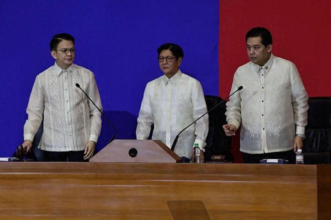 当地时间2025年7月28日,国会全体会议厅,菲律宾总统马科斯(中)在发表国情咨文(SONA)前,与埃斯库德罗(左)和罗穆亚尔德斯(右)站在一起。图/视觉中国