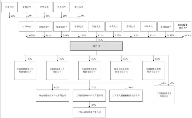 IPO前,李氏兄弟透过(i)江西东亮,一家由李氏兄弟各自持有20.0%权益的公司,持有金晟新能源已发行及流通在外股份总数20.39%;(ii)肇庆晟达,李森为其普通合伙人,持有金晟新能源已发行及流通在外股份总数5.45%;(iii)肇庆森龙持有金晟新能源已发行及流通在外股份总数2.48%;及(iv)李氏兄弟各自持有的直接实益权益,合计为金晟新能源已发行及流通在外股份总数26.73%,控制公司约55.05%投票权。