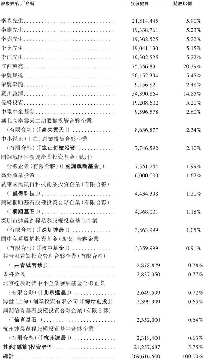 IPO前,李森直接持股为5.9%,李鑫直接持股为5.23%,李尧直接持股为5.22%,李炎直接持股为5.15%,李汪直接持股为5.22%,江西东亮持股为20.39%,肇庆晟达持股为5.45%,肇庆森龙持股为2.48%;