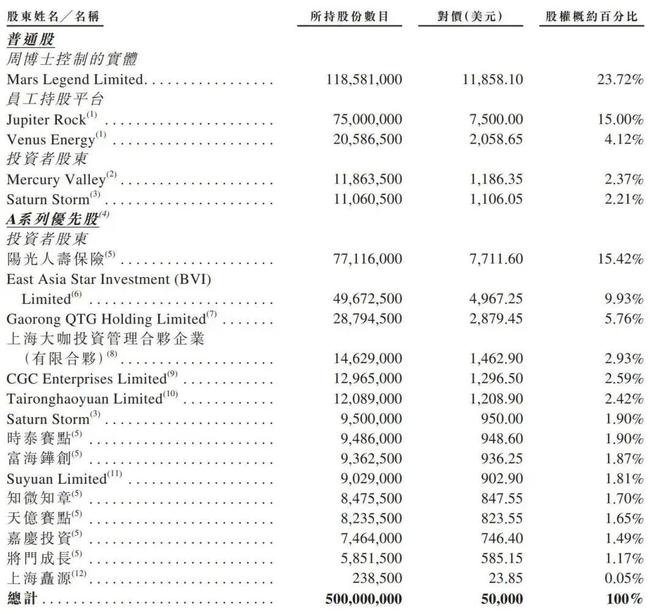 IPO前,周灏通过Mars Legend Limited直接持股为23.72%,员工持股平台Jupiter Rock持股为15%,员工持股平台Venus Energy持股为4.12%。