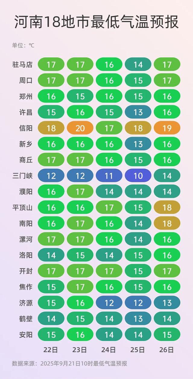 受近期冷空气和降水影响,我省大部的温度可谓是凉意十足,今起三天,全省大部的最高温度仍在20度上下,最低温度只有15度左右,例如后天郑州最高气温只有17度,体感湿凉,需注意防雨、添衣。但随着24日降水范围缩小,我省的温度开始回升至25度以上,但最低温度并无起色,昼夜温差超10度以上!建议大家采用“洋葱穿衣法”,及时关注气温变化,适时调整穿搭。