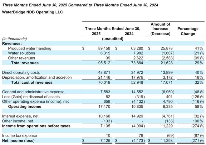 WaterBridge在2025年第二季度营收为9551万美元,较上年同期的7388万美元增长29%;净利为713万美元,上年同期的净亏损为417万美元。