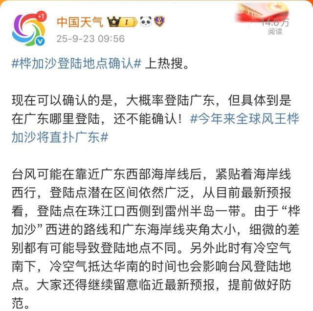 最新的台风预警也将“桦加沙”登陆时强度调整为台风级或强台风级(13-15级,40-48米/秒),可能于明天中午到晚上在广东珠海到湛江一带沿海登陆,大家还需留意最新预报。