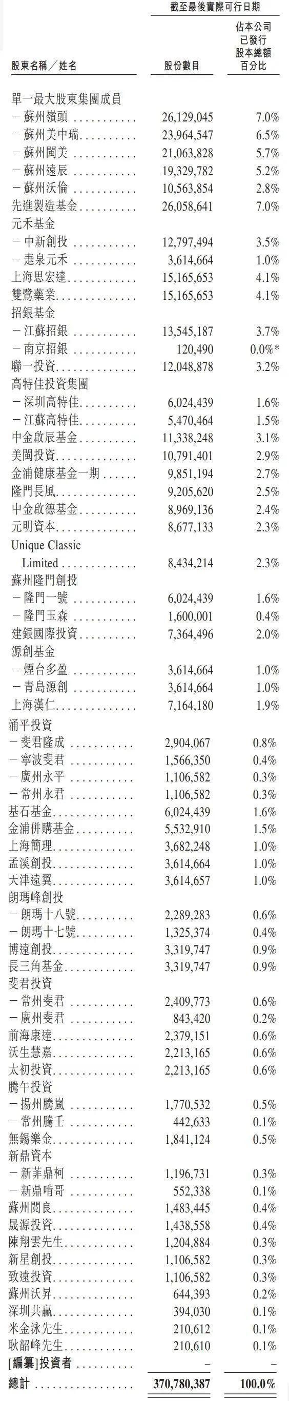 中新创投持股为3.5%,联一投资持股为3.2%,中金启辰持股为3.1%,苏州美闽持股为2.9%,苏州沃伦持股2.8%,金浦健康基金一期持股2.7%,隆门投资持股为2.5%,中金启德持股2.4%,元明产业基金持2.3%,UniqueClassic Limited持股为2.3%,珠海建银持股2%;