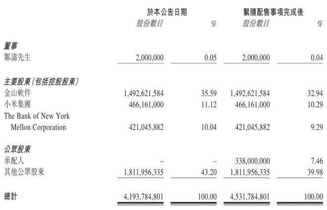 此次配售后,金山软件持股为32.94%,小米持股为10.29%,The Bank of New York Mellon Corporation持股为9.29%。