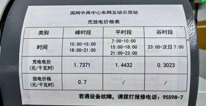 国网中再中心车网互动示范站充放电价格表(摄影/刘珊珊)