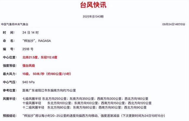 中央气象台最新消息,9月24日14时,“桦加沙”减弱为强台风级,中心附近最大风力为15级,50米/秒(约180公里/小时),中心位于距离广东省阳江市东偏南方向约75公里的海面上。预计“桦加沙”将以每小时20-25公里的速度向偏西方向移动,强度逐渐减弱。