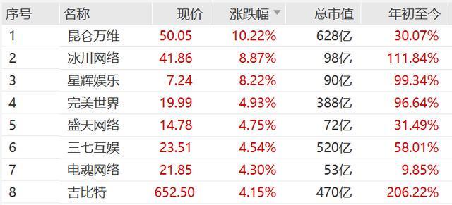 上午,游戏、电商概念股涨幅居前,昆仑万维大涨10.22%,冰川网络、星辉娱乐涨超8%,完美世界、盛天网络、三七互娱、电魂网络、吉比特涨超4%。