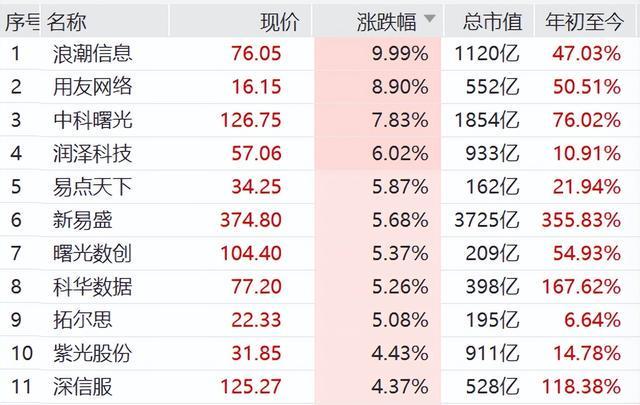 浪潮信息10cm涨停;用友网络一度涨停,截至午盘涨8.9%。