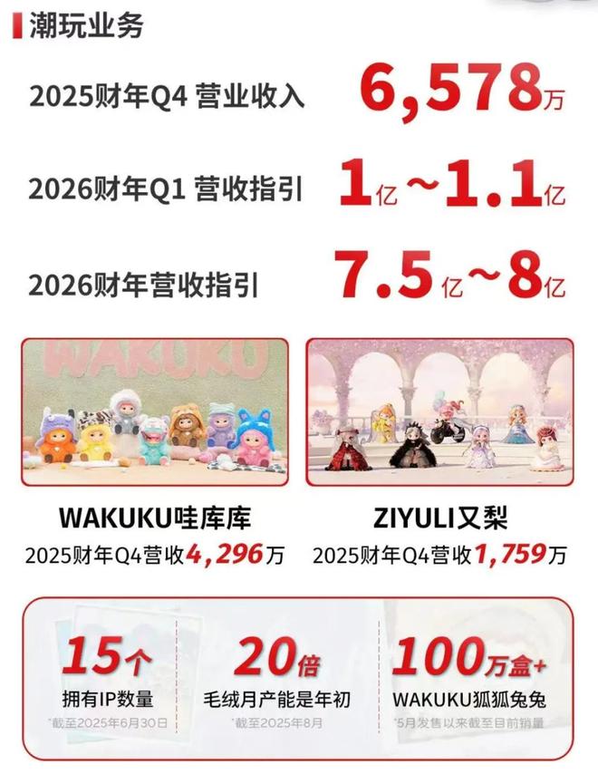 量子之歌财报显示,2025财年公司全年实现营收27.26亿元,净利润3.57亿元;第四季度营收6.18亿元,净利润1.08亿元。本季度首次纳入披露的潮玩业务实现营收6578万元,占总营收约10.6%。公司现金储备达10.41亿元,为潮玩业务的IP开发、渠道拓展及国际化布局提供充足资金保障。