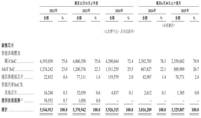 晶晨半导体2025年上半年智能多媒体及顯示SoC收入为23.6亿,占营收的比例为70.9%;来自AIoT SoC收入为8.9亿元,占营收的比例为26.7%。