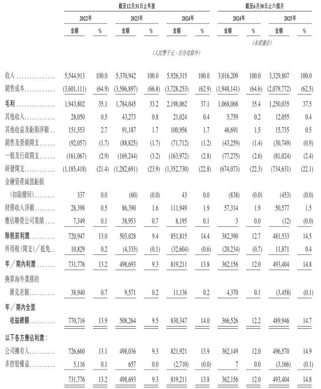 招股书显示,晶晨半导体2022年、2023年、2024年营收分别为55.45亿元、53.71亿元、59.26亿元;毛利分别为19.44亿元、17.84亿元、21.98亿元;毛利率分别为35.1%、33.2%、37.1%;期内利润分别为7.32亿元、5亿元、8.19亿元。