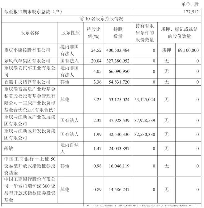 截至2025年6月30日,重庆小康控股有限公司(简称“小康控股”)持股24.52%,东风汽车公司持股20.04%,重庆渝安汽车工业有限公司(简称“渝安工业”)持股4.05%,香港中央结算有限公司持股为3.36%;