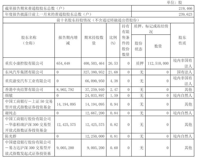 截至2024年12月31日,重庆小康控股有限公司(简称“小康控股”)持股26.53%,东风汽车公司持股21.68%;