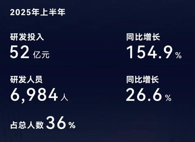 截至2025年6月30日,赛力斯研发人员共计6,984人,同比增长26.6%,占公司总人数的比例提升至36%;公司研发投入同比增长154.9%。
