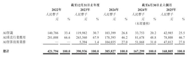 华付技术2025年上半年来自AI智识的收入为4299万元,占比为25.5%;来自AI垂直行业应用收入为7881万元,占比为46.7%;来自AI智算技术业务收入为4701万元,占比为27.8%。