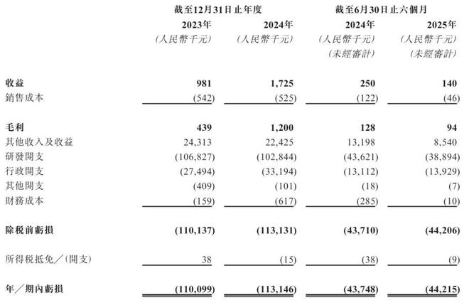 滨会生物2023年、2024年营收分别为98万元、172.5万元;期内亏损分别为1.1亿元、1.13亿元;2025年上半年营收为14万元,上年同期的营收为25万元;期内亏损为4422万元,上年同期的期内亏损为4375万元。