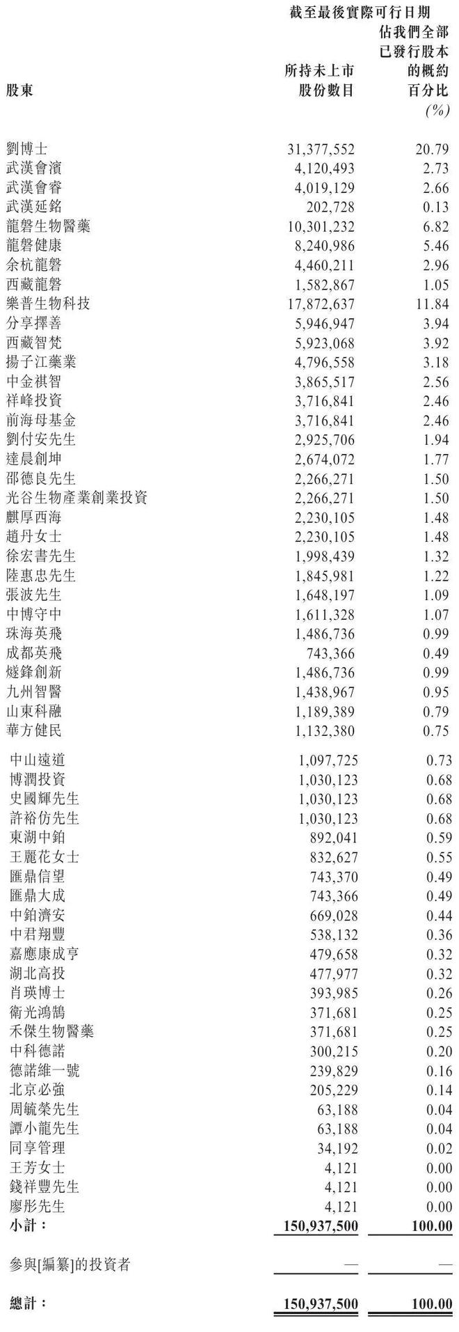 IPO前,刘滨磊博士持股为20.79%,武汉会滨持股为2.73%,武汉会睿持股为2.66%,武汉延铭持股为0.13%,龙磐生物医药持股为6.82%,龙磐健康持股为5.46%,余杭龙磐持股为2.96%,西藏龙磐持股为1.05%。