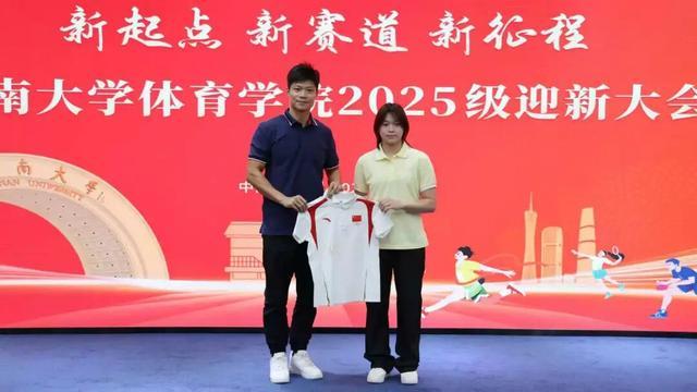 当晚,暨南大学体育学院举行了迎新活动,全红婵现场送给学院一件亲笔签名的巴黎奥运会出场服,苏炳添代表学院接受捐赠,还与全红婵合影留念。