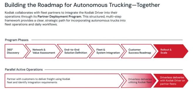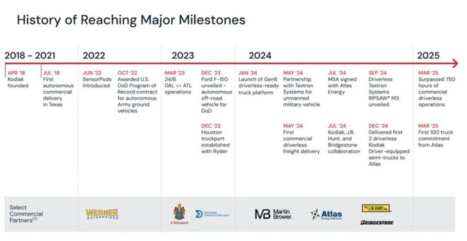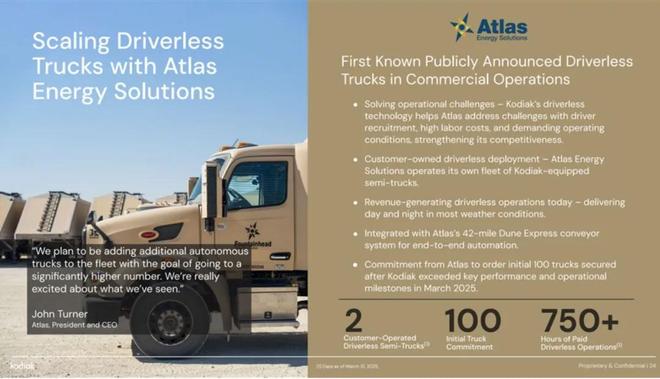 2025年1月,Kodiak向客户Atlas Energy Solutions交付了首批两辆自动驾驶卡车,标志着其首次商业化运营。Atlas已承诺购买首批100辆卡车,以协助其在西德克萨斯州偏远的二叠纪盆地运输压裂砂。