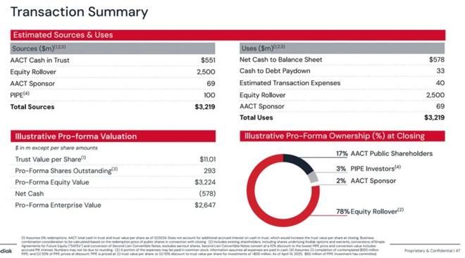 交易后,新公司名称为Kodiak AI,Equity Rollover持股为78%,AACT Public股东持股17%,PIPE股东持股3%,AACT Sponsor持股为2%。