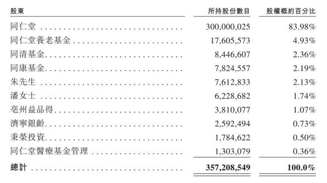 其中,同仁堂持股为83.98%,同仁堂养老基金持股为4.93%,同康基金持股为2.19%,同仁堂医疗基金管理持股为0.36%,同清基金持股为2.36%,朱先生持股为2.13%,潘女士持股为1.74%,亳州益品得持股为1.07%,济宁银龄持股为0.73%,秉荣投资持股为0.5%。