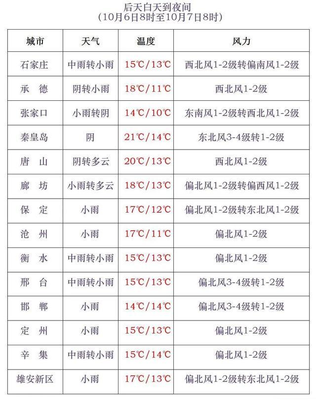 6日夜间到7日,承德中北部和保定、廊坊以南地区阴有小雨,其中石家庄、邢台、邯郸三个地区的西部有中雨,其他地区阴转多云。