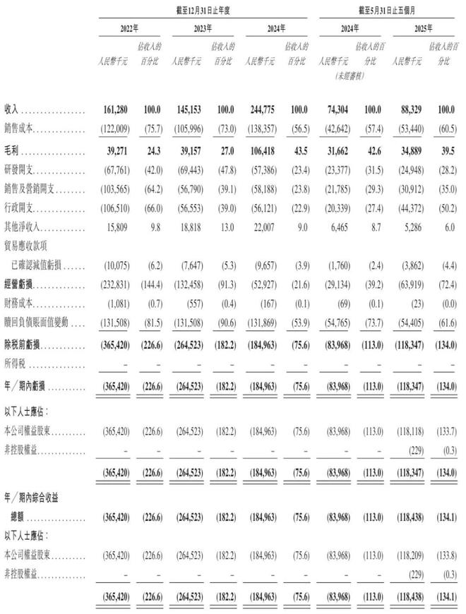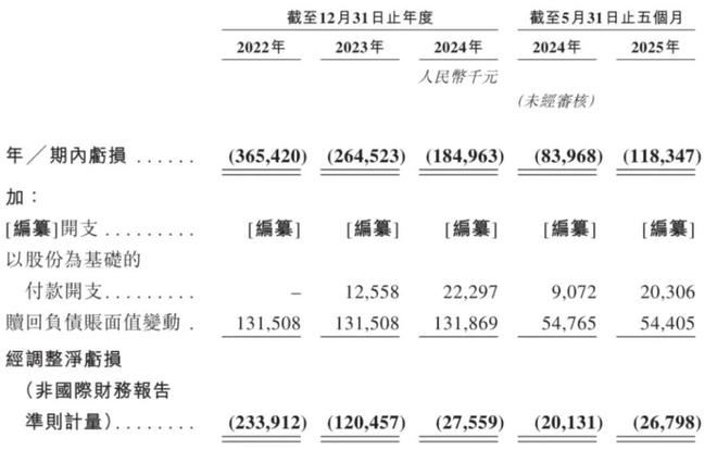 云迹科技2022年、2023年、2024年经调整净亏损分别为2.33亿元、1.2亿元、2756万元。云迹科技2025年前5个月经调整净亏损2680万元。