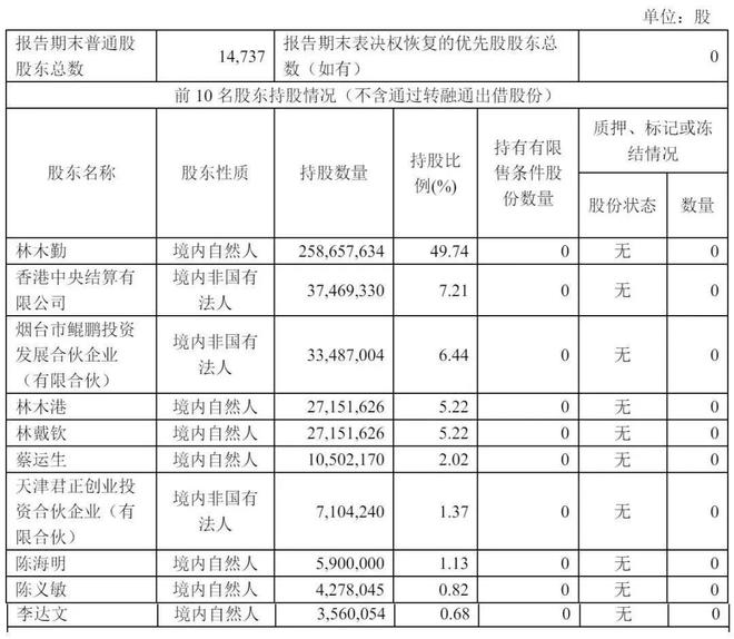 截至2025年3月31日,林木勤持股为49.74%,香港中央结算有限公司持股为7.21%,烟台市鲲鹏投资发展合伙企业(有限合伙)持股为6.44%,林木港、林戴钦分别持股为5.22%,