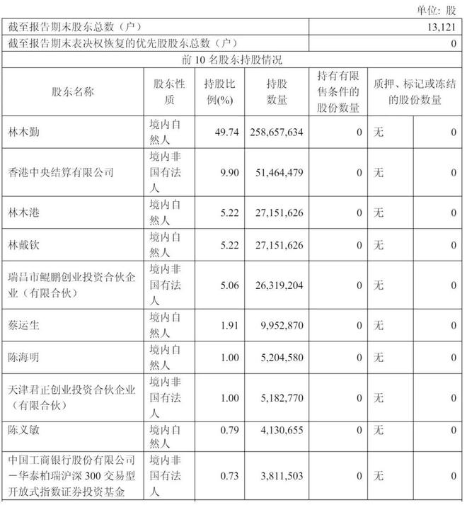 截至2025年6月30日,林木勤持股为49.74%,香港中央结算有限公司持股为9.9%,林木港、林戴钦分别持股为5.22%,瑞昌市鲲鹏创业投资合伙企业(有限合伙)持股为5.06%;