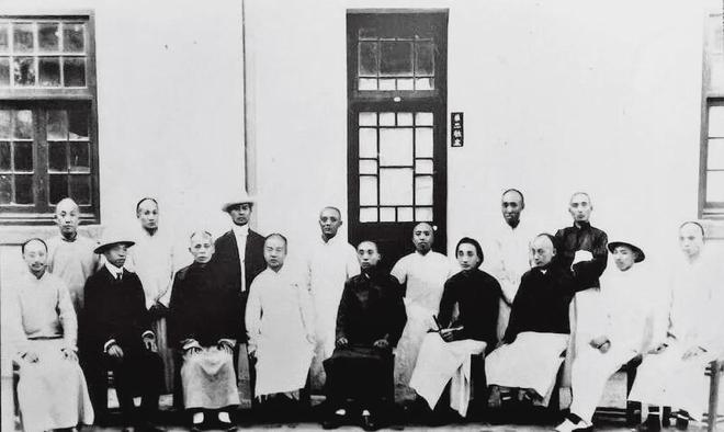 1906年,黄炎培应杨斯盛邀请,在上海创办浦东中学并担任校长。图为1907年黄炎培(后排右一)与杨斯盛(前排左三)及浦东中学校董、教师等在浦东中学校舍前合影。