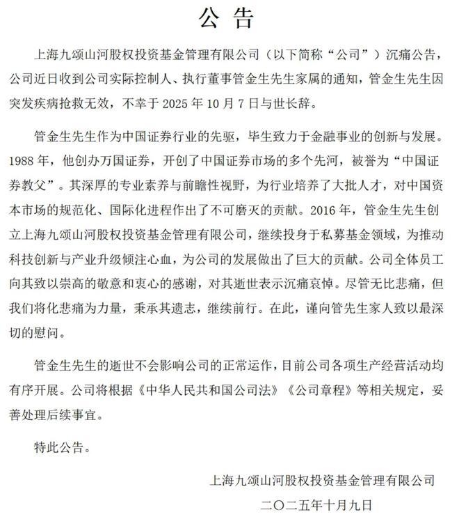 上海九颂山河股权投资基金管理有限公司(简称“九颂基金”)日前发布公告称,公司近日收到公司实际控制人、执行董事管金生家属的通知,管金生因突发疾病抢救无效,于2025年10月7日去世。