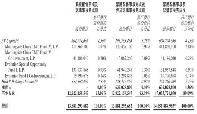 此次交易前,五源资本持股为3.49%,高瓴持股为2.55%;此次交易后,五源资本持股为3.34%,高瓴持股为2.44%,承配人持股为4.4%。
