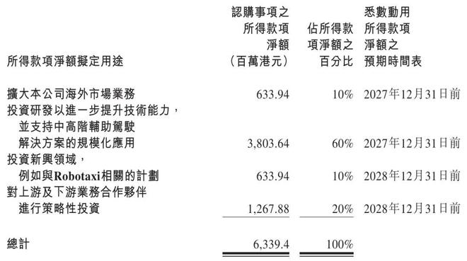 地平线称,此次募资中38亿港元用于投资研发以进一步提升技术能力,并支持中高阶辅助驾驶解决方案的规模化应用;12.68亿元用于对上游及下游业务合作伙伴进行策略性投资;6.34亿元用于扩大公司海外市场业务;12.68亿元用于对上游及下游业务合作伙伴进行策略性投资。