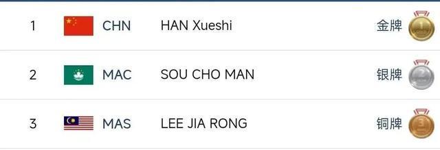中国选手韩雪诗以9.746高分夺得金牌,中国澳门选手苏楚雯获得银牌,铜牌获得者为马来西亚选手李佳蓉。