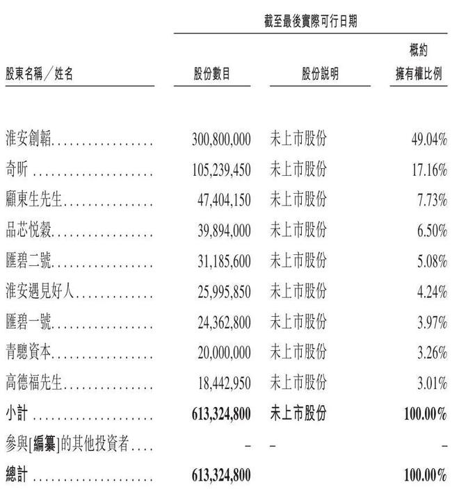 IPO前,淮安创韬持股为49.04%,弘毅投资通过百福控股旗下奇昕持股为17.16%,顾东生持股为7.73%,九毛九旗下品芯悦谷持股为6.5%,汇碧二号持股为5.08%;