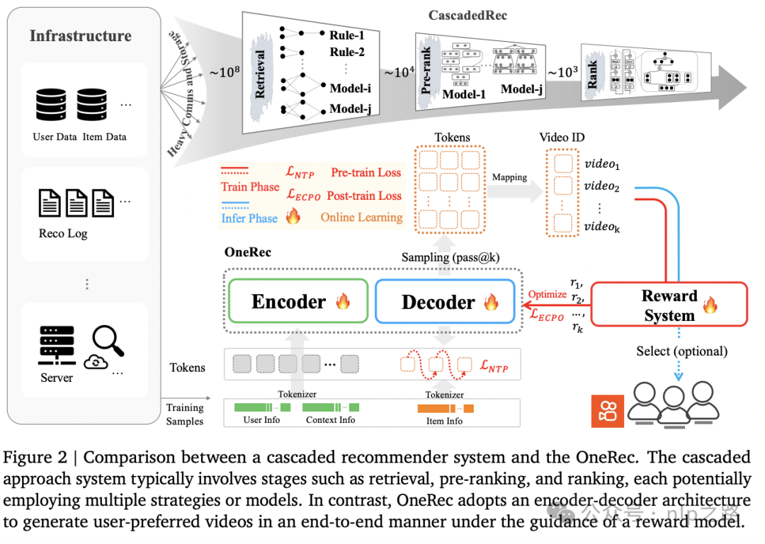 传统的级联推荐系统CascadedRec和新兴的一体化推荐系统OneRec对比示意图