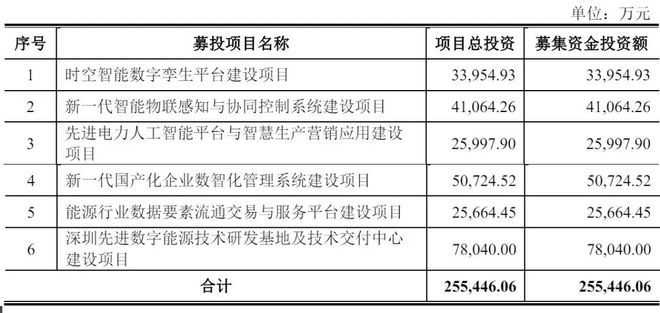 南网数字计划募资25.54亿元,其中,3.4亿元用于时空智能数字孪生平台建设项目,4.1亿元用于新一代智能物联感知与协同控制系统建设项目,2.6亿元用于先进电力人工智能平台与智慧生产营销应用建设项目,5.1亿元用于新一代国产化企业数智化管理系统建设项目,2.6亿元用于能源行业数据要素流通交易与服务平台建设项目,7.8亿元用于深圳先进数字能源技术研发基地及技术交付中心建设项目。