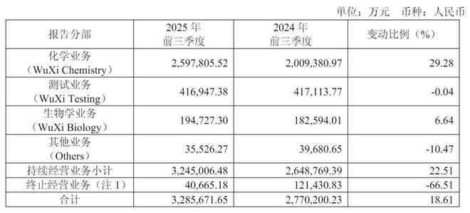 药明康德2025年前三季度来自化学业务(WuXi Chemistry)收入为200.94亿元,同比增长29.28%;