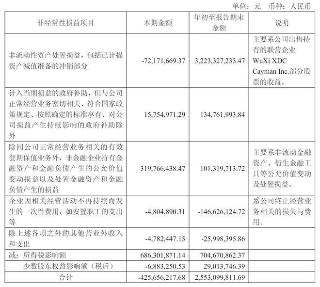 药明康德2025年前9个月非流动性资产处置损益,包括已计提资产减值准备的冲销部分为32.23亿元,其中,第三计入计入7217万元,主要系公司出售持有的联营企业WuXi XDCCayman Inc.部分股票的收益。